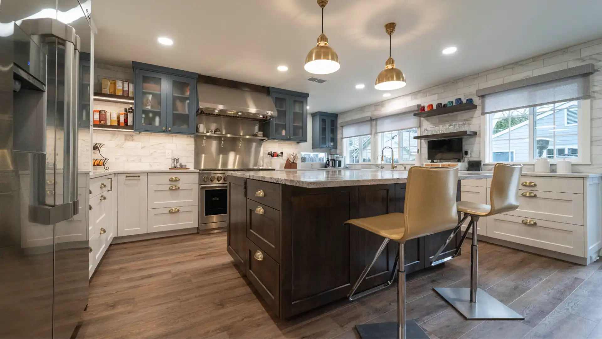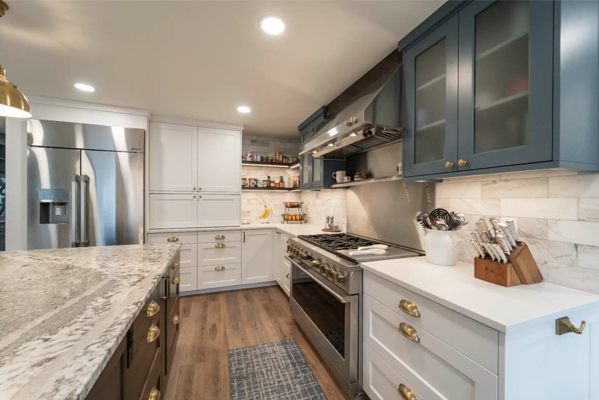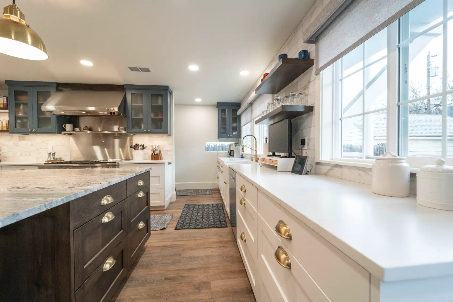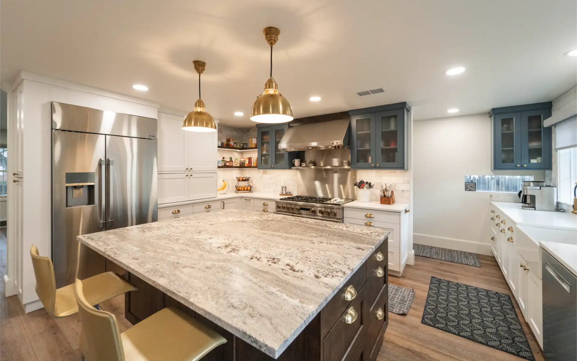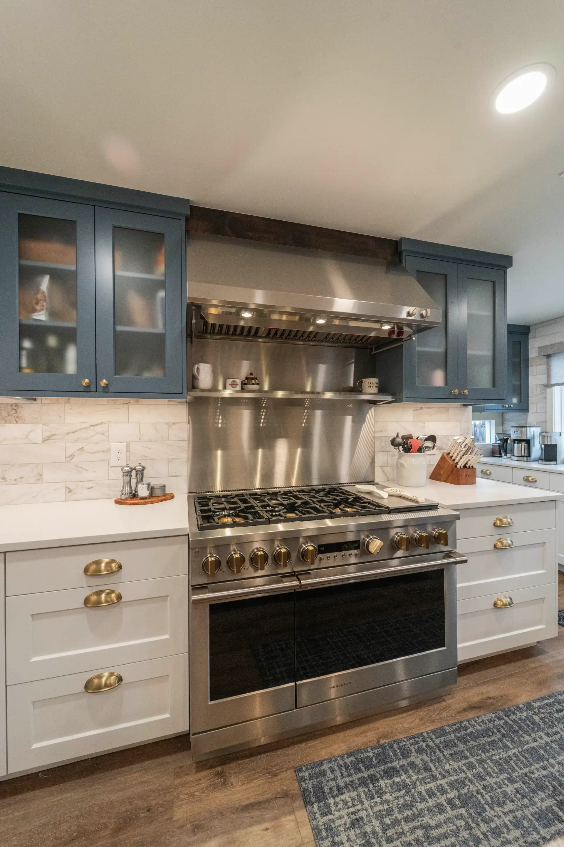 Construction Challenges/Our solutions –Blending a 90-year-old home with a 30-year-old addition came with its share of surprises, especially once we opened up the walls between the two structures. Our main priority was creating an intentional transition—most importantly, a smooth, continuous ceiling line. Because the framing from the original home and the newer addition didn’t align, we collaborated with our engineering team to design a steel beam system that allowed us to hang joists from both sides. This provided the support we needed without introducing unwanted ceiling drops. As we refined the layout, we also discovered that the electrical panel landed in an awkward and non-compliant spot near the stairs. To fix this, we shifted it a few feet onto the adjacent wall, bringing it up to code and ensuring it wouldn’t interfere with the new design. Demolition brought one final surprise: a toilet drain line located one bay off from where it should’ve been. To keep the layout intact, we shortened the cabinet above the refrigerator by six inches and rerouted the drain around the new steel beam before tying it back into the wall. Each challenge required thoughtful coordination across trades, but the end result is exactly what we aimed for—a clean, cohesive space with no visible trace of the complexities hidden behind the drywall.